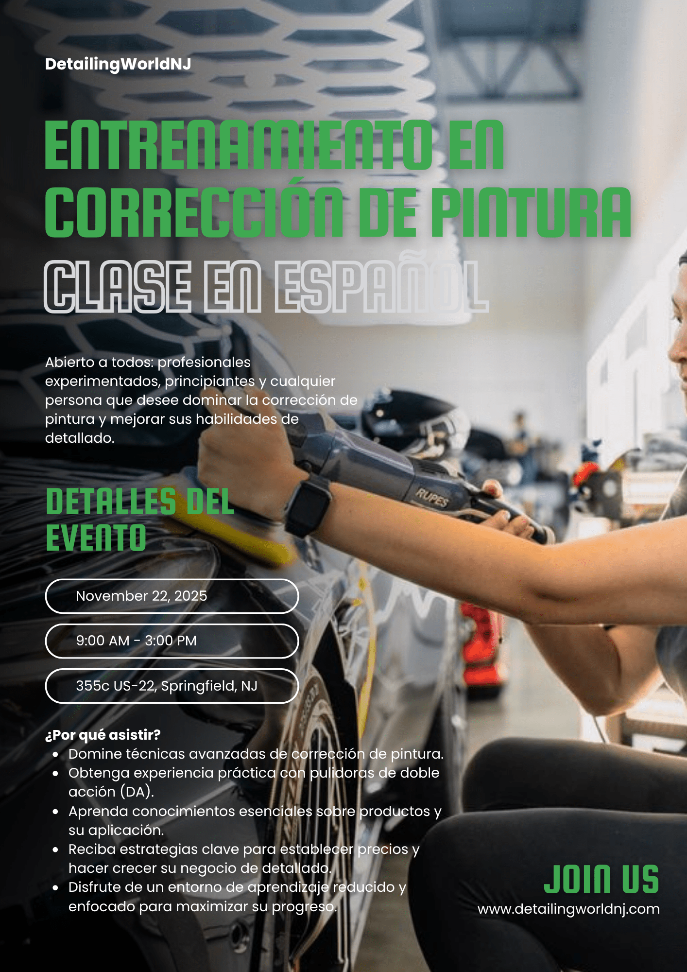 Descubra las habilidades para convertirse en un especialista en corrección de pintura en nuestro curso práctico de 1 día.Capacitación en corrección de pintura¡Clase! Diseñado para detallistas de todos los niveles, este curso es una experiencia inmersiva en técnicas avanzadas de corrección de pintura, manejo de herramientas y estrategias comerciales esenciales. Guiado por instructores expertos, adquirirá conocimientos prácticos y profundos sobre la aplicación de productos, el uso correcto de pulidoras DA y técnicas para eliminar remolinos. La clase también incluye información sobre cómo establecer una estructura de precios y estrategias de marketing para impulsar su negocio de detallado.
