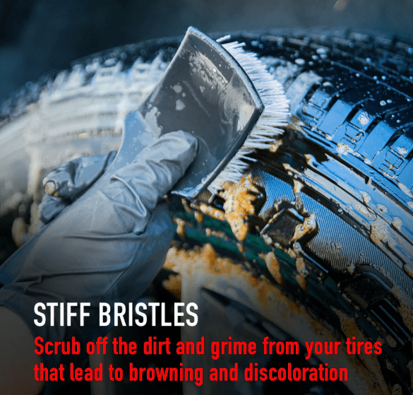 Deep Cleaning Brush: Tire Scrub Brush is perfect for tires and wheel rims when deep cleaning is needed. Perfect For Cleaning Tires: Scrub off the dirt and grime with the stiff bristles, that cover the face of the brush, from your tires that lead to browning and discoloration. Ergonomic Design: The long plastic handle with a curved shape is designed for a solid grip, allowing a quick scrub of contaminants. Storage hole for convenient hanging. Applicable to clean tires on all types of vehicles